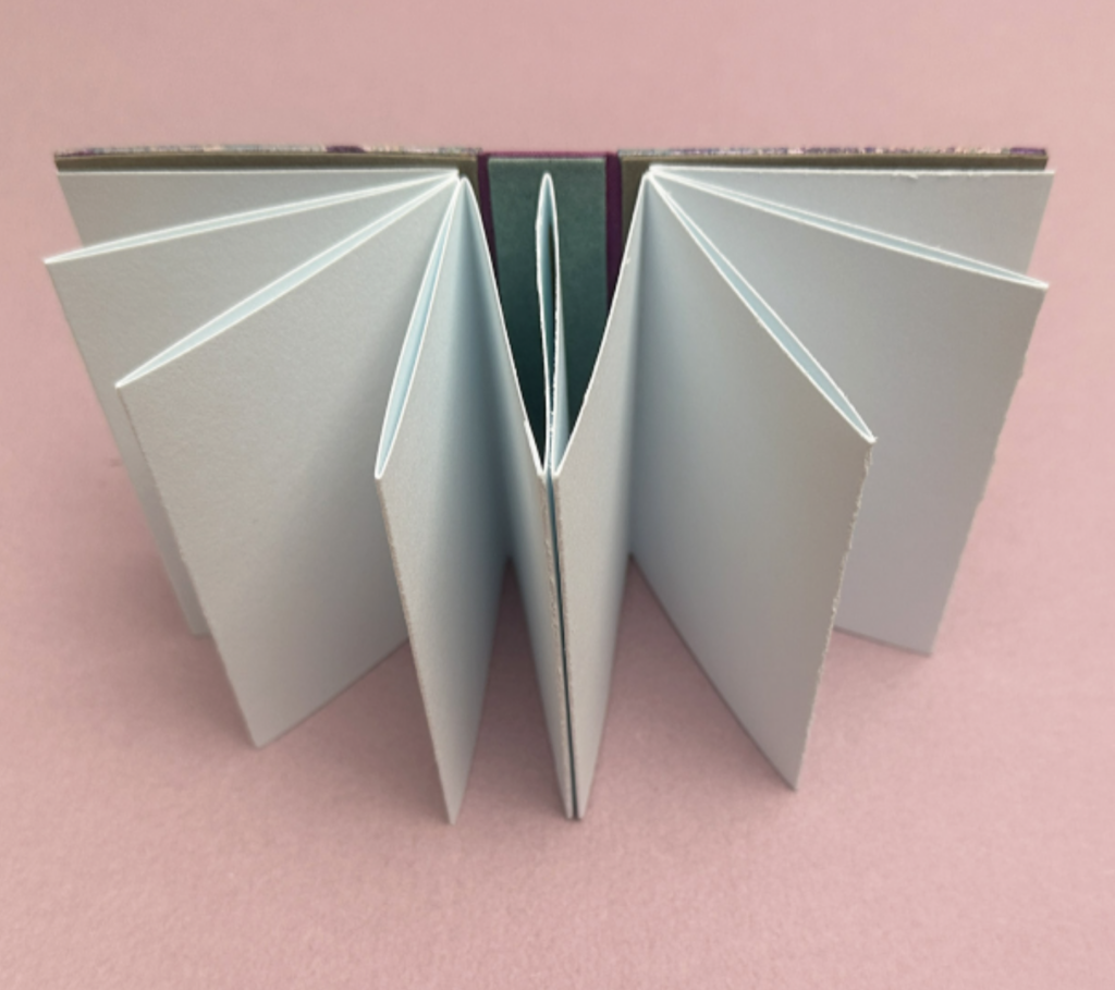 The Double Panel Binding came about when Erin was creating a decorative binding for a large, unwieldy accordion text block. The goal was to develop a binding style that could open completely flat making it easier to unfurl the accordion. Pulling from box-making techniques learned from John DeMerritt and der gebrochene rücken (a variant of the German Bradel Binding), the covers come together when fully opened, inviting a design that can span across the entire binding. Each board is constructed separately and out of two covered panels. The inner boards conceal the spine attachment and give space to sew in the accordion or single signature.