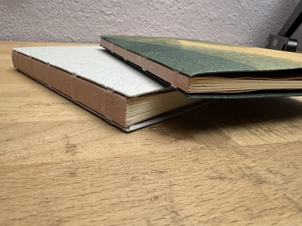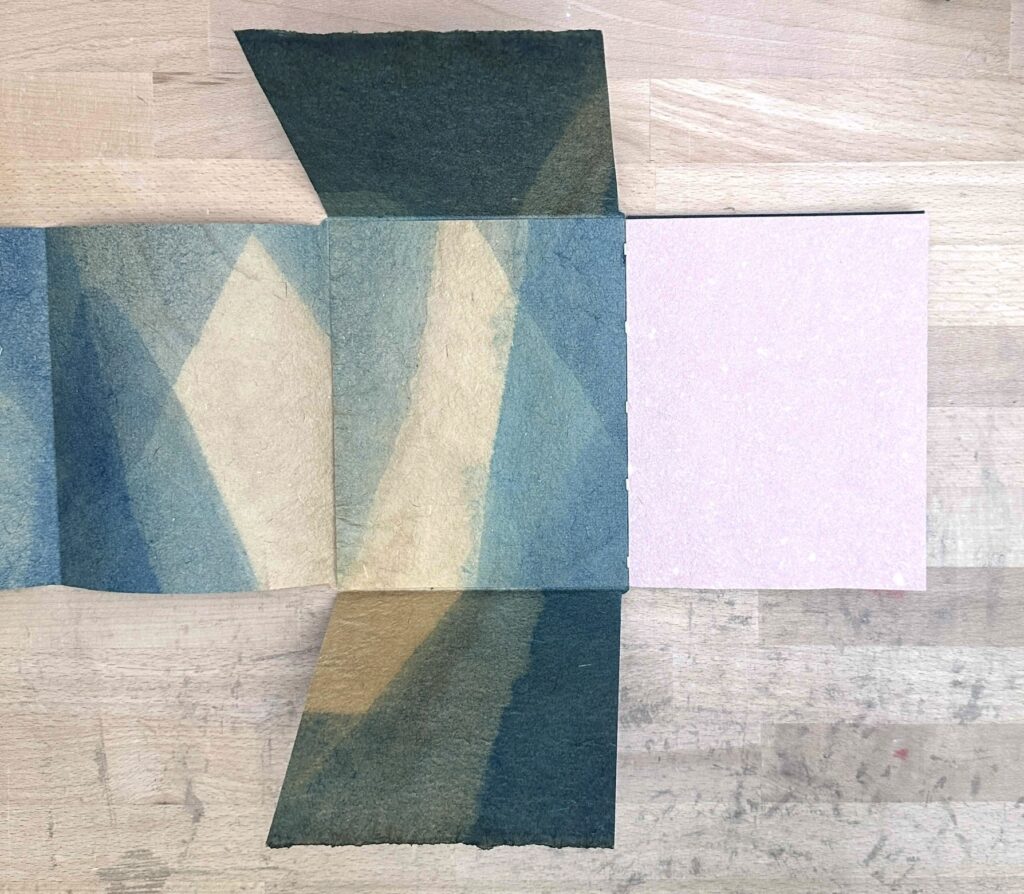 Finding inspiration in a 15th century limp vellum binding where the cover was formed into a wallet, Clara Gevaert slowly began to develop her Envelope Binding structure. This simple, yet rather elegant structure requires very little adhesive and each cover is folded out of a single sheet of handmade paper. The book opens relatively flat and is suitable for lightweight text blocks.