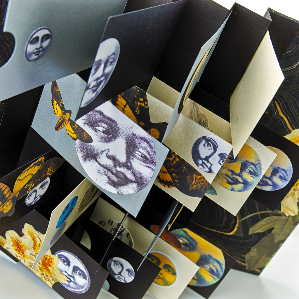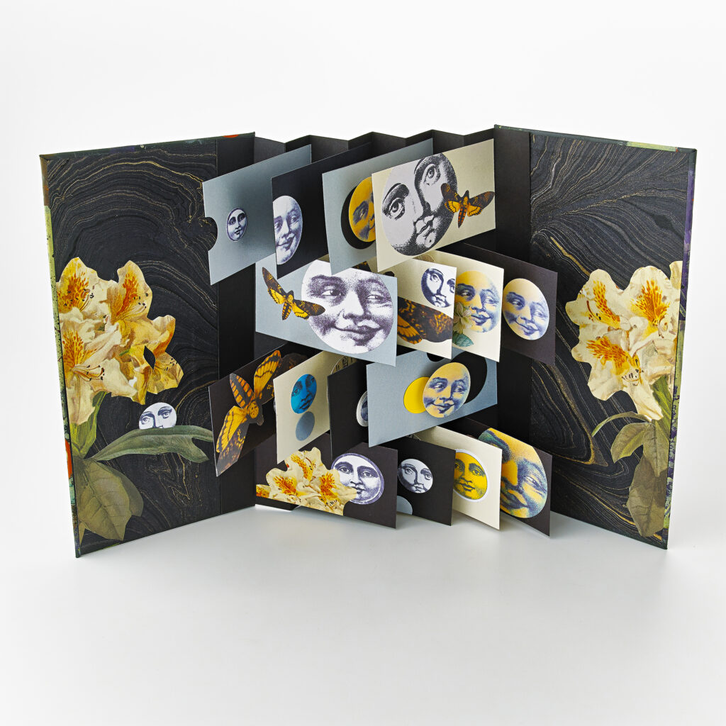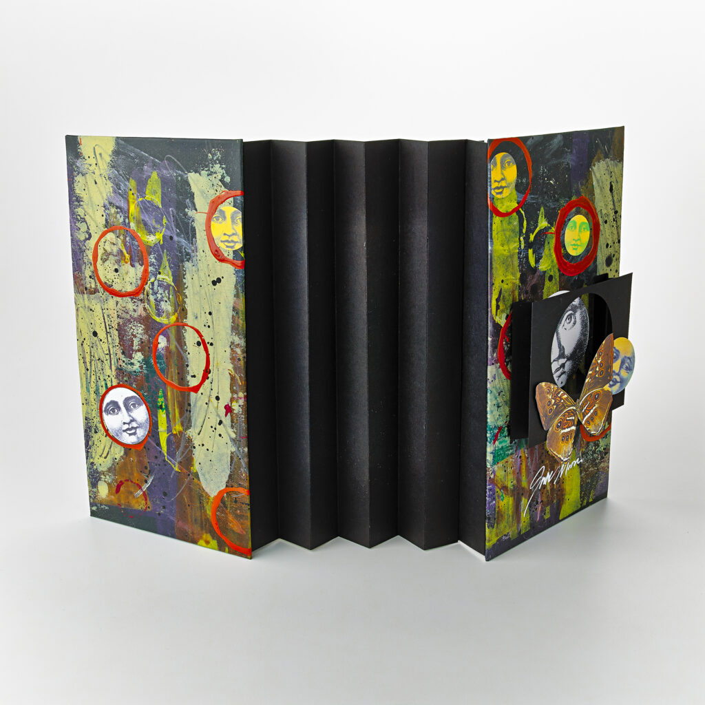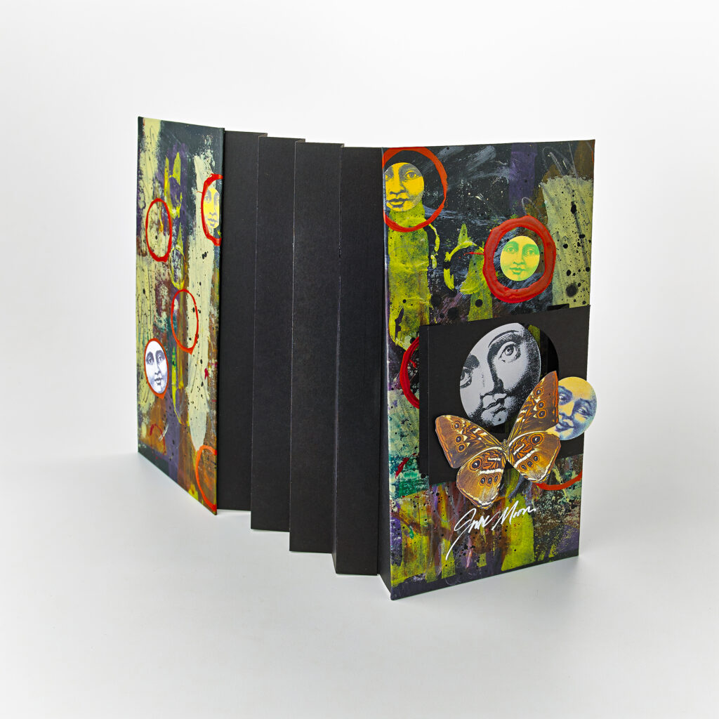 Class Description: Rosemary will share design theory, color application and collage techniques as she ushers us through these SDBA classes. Celebrate summer blooms and sunny moons with a truly original flag book showcasing your painting, collage and book-making techniques. This class is perfect for anyone excited to explore a different twist on a creative book structure. Originally created by Hedi Kyle, our traditional flag book has small panels that cross each other when the book opens and closes.